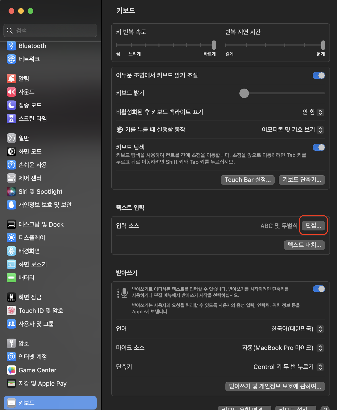 - 키보드 > 입력 소스 > 편집