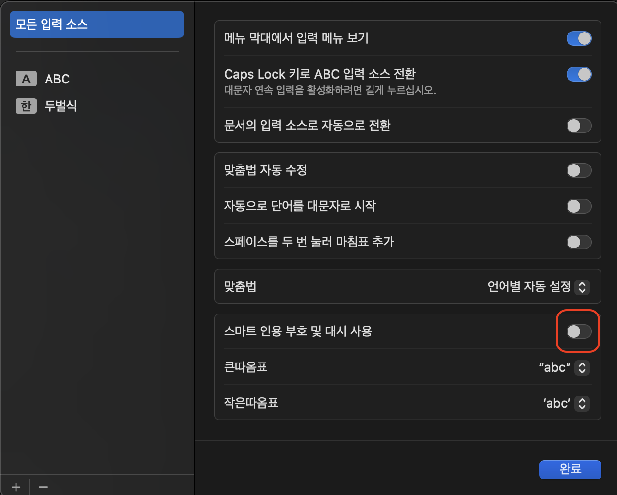 - 스마트 인용 부호 및 대시 사용 비활성화