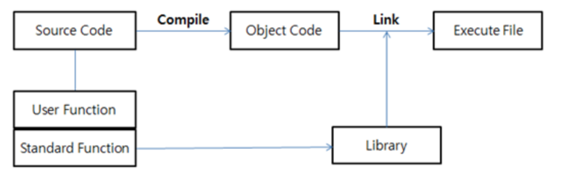- c언어에서의 라이브러리는 소스코드를 컴파일하여 Object Code로 만들고나서 생겨난 Object Code를 꺼내서, Static Link방식을 통해 Execute file에 결합