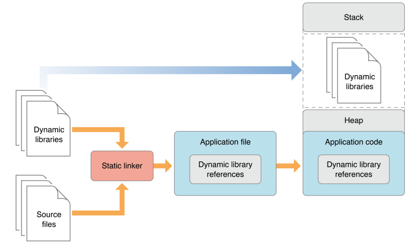 - Static Linker를 통해 Static Library 코드가 Execute file(= appliccation file) 내로 들어가 Heap 메모리에 상주
