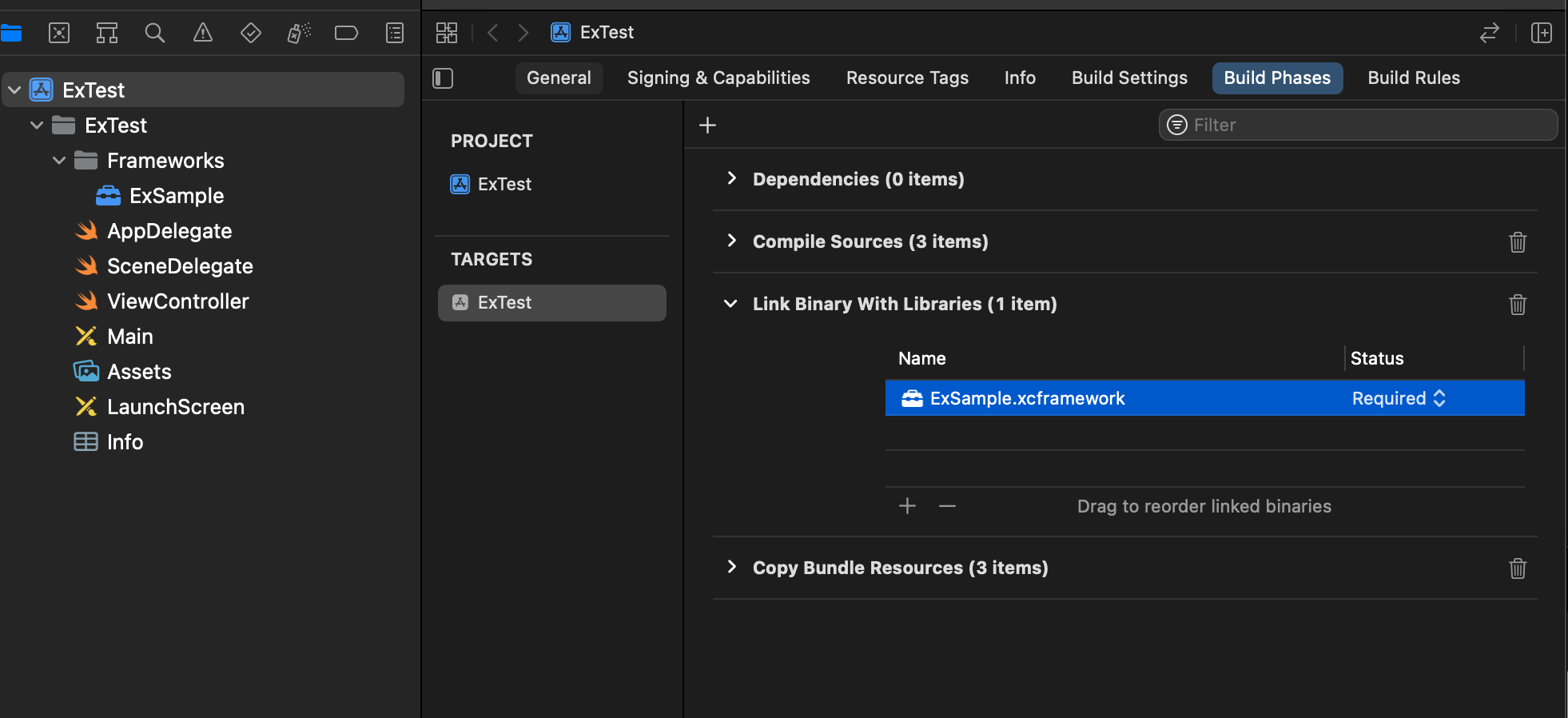 - Targets > Build Phases > Link Binary With Libraies에서 ExSample.xcframework가 Required 되어있는 것을 확인