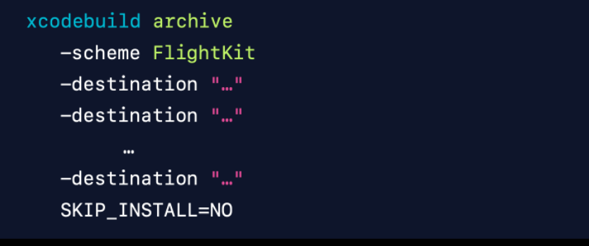 - Xcode command line인 xcodebuild archive 명령어를 통해 시뮬레이터를 포함한 디바이스 타겟을 여러개로하여 아카이빙