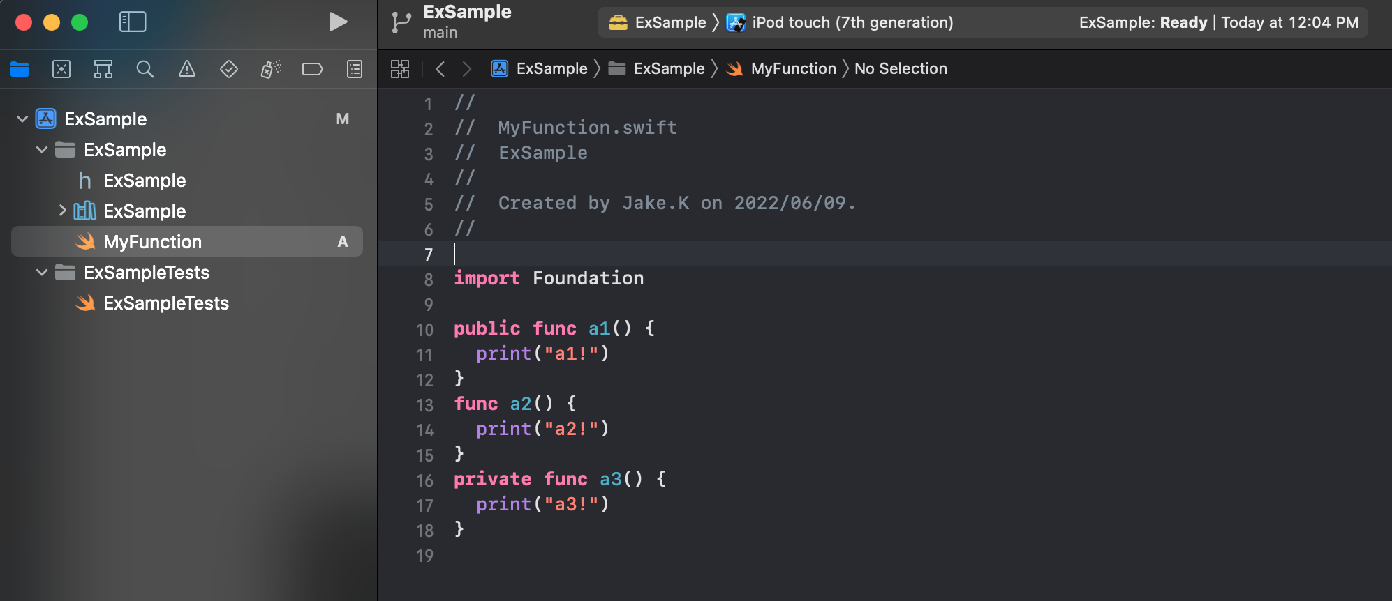 - 각 함수는 public, internal, private으로 정의하여 사용할때 어떻게 표시되는지 확인을 위함