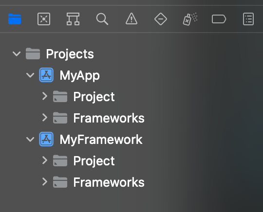- Workspace가 있고, Projects 하위에 다수의 Project(MyApp, MyFramework)가 존재하는 형태