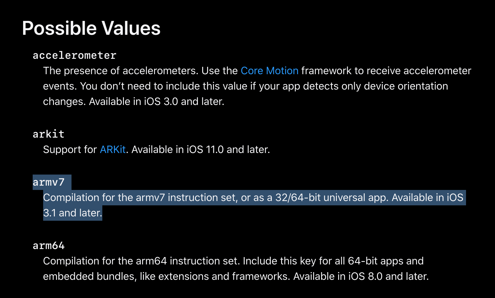 <key>UIRequiredDeviceCapabilities</key> <array> <string>armv7</string> </array>