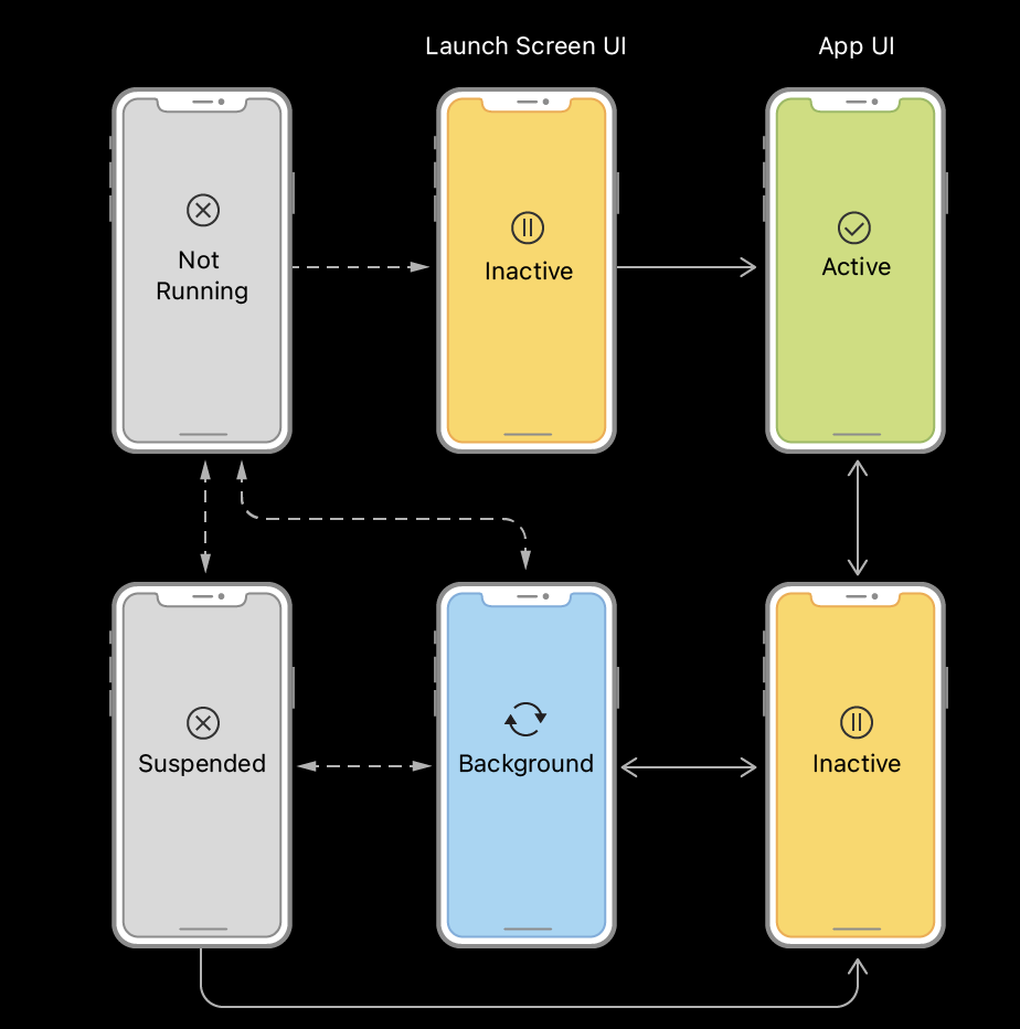 - ApplicationState는 크게 Not Running, Inactive, Active, Background, Suspended 상태가 존재
