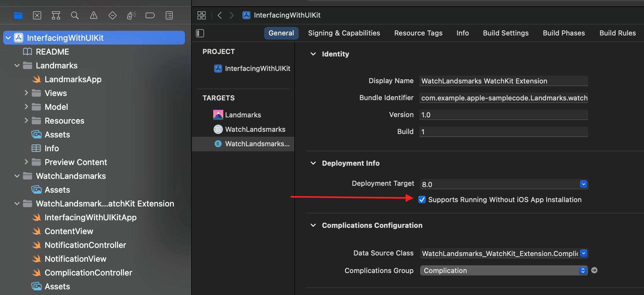 - Target > ... WatchKit Extension > Supports Running Without iOS App Installation 체크