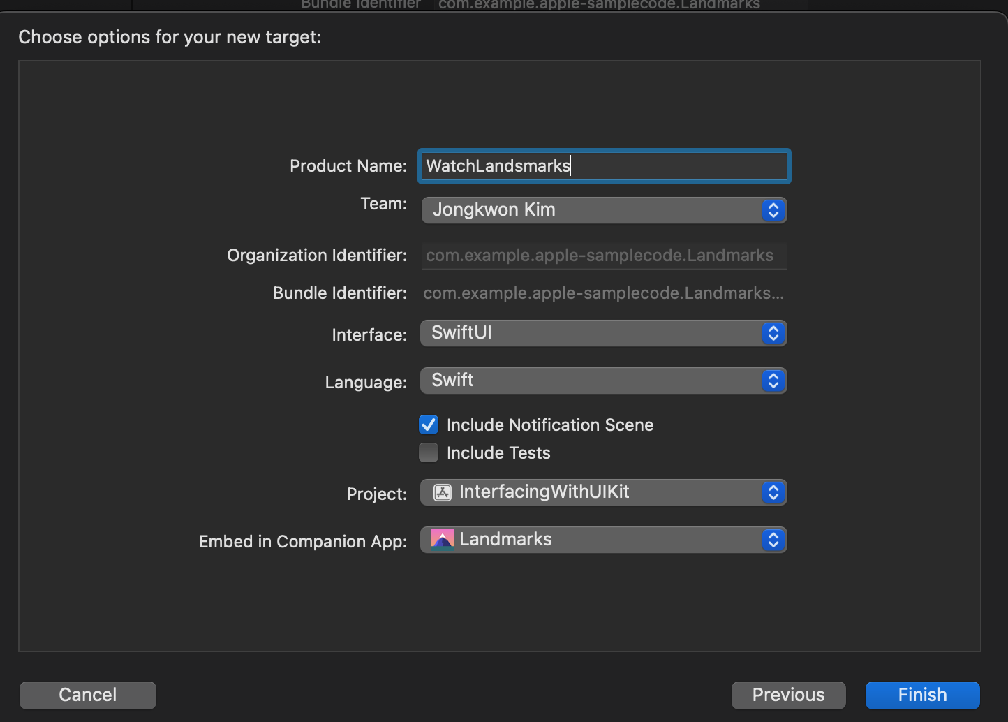 - Cancel을 선택해도, Scheme > WatchLandsmarks를 선택하여 워치앱을 빌드가 가능