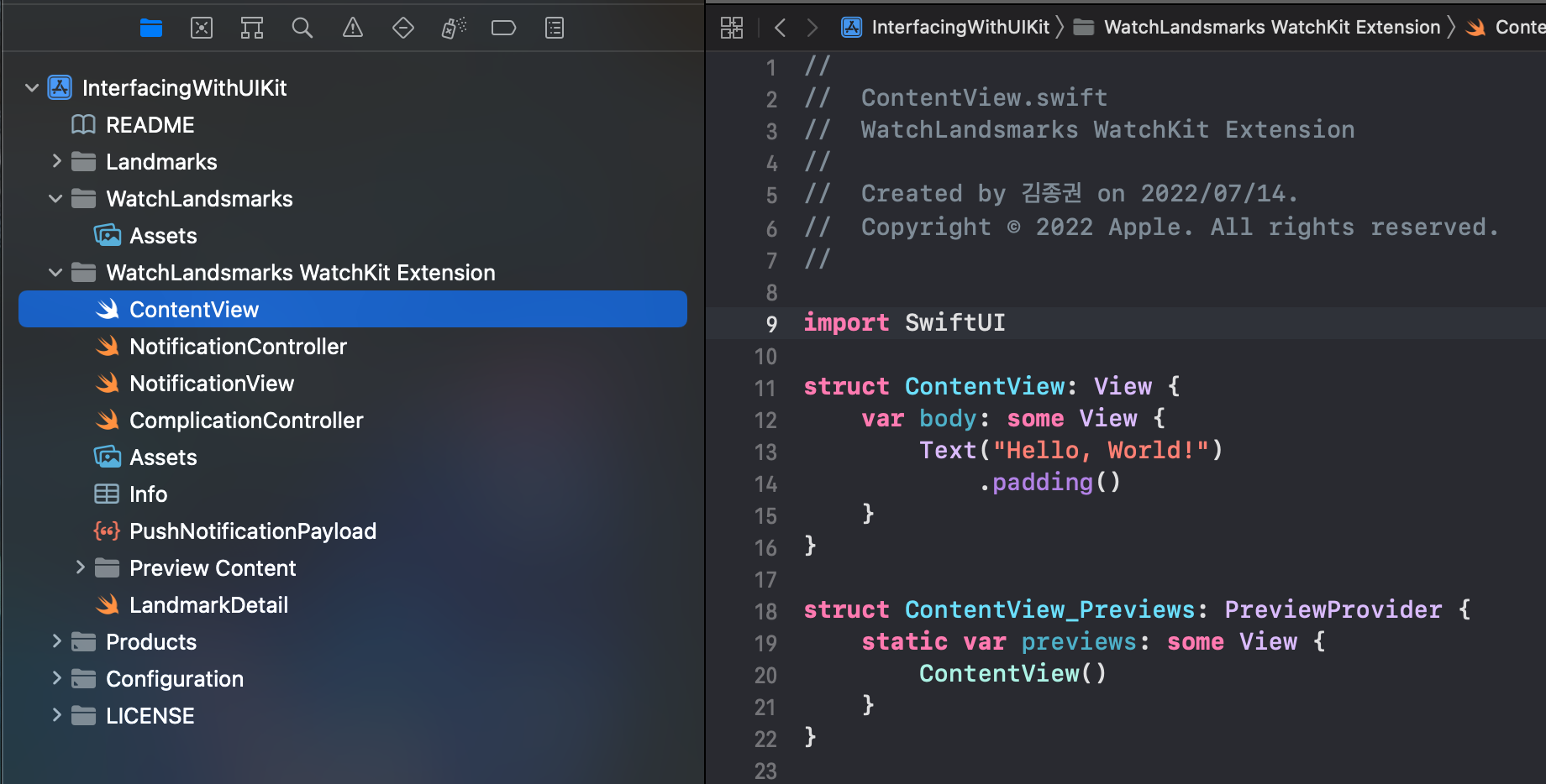 - WatchKit Extension 하위에 있는 ContentView 탭