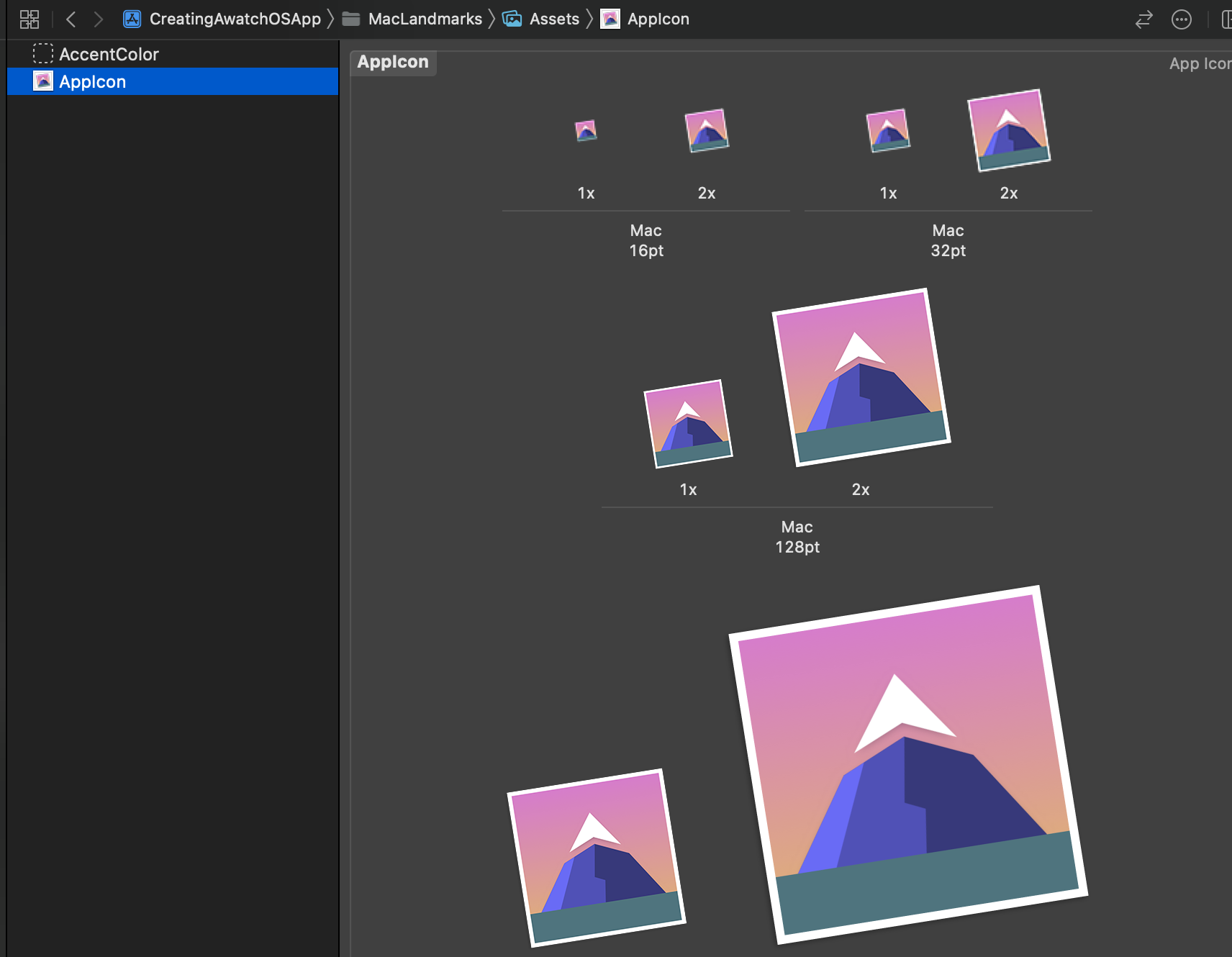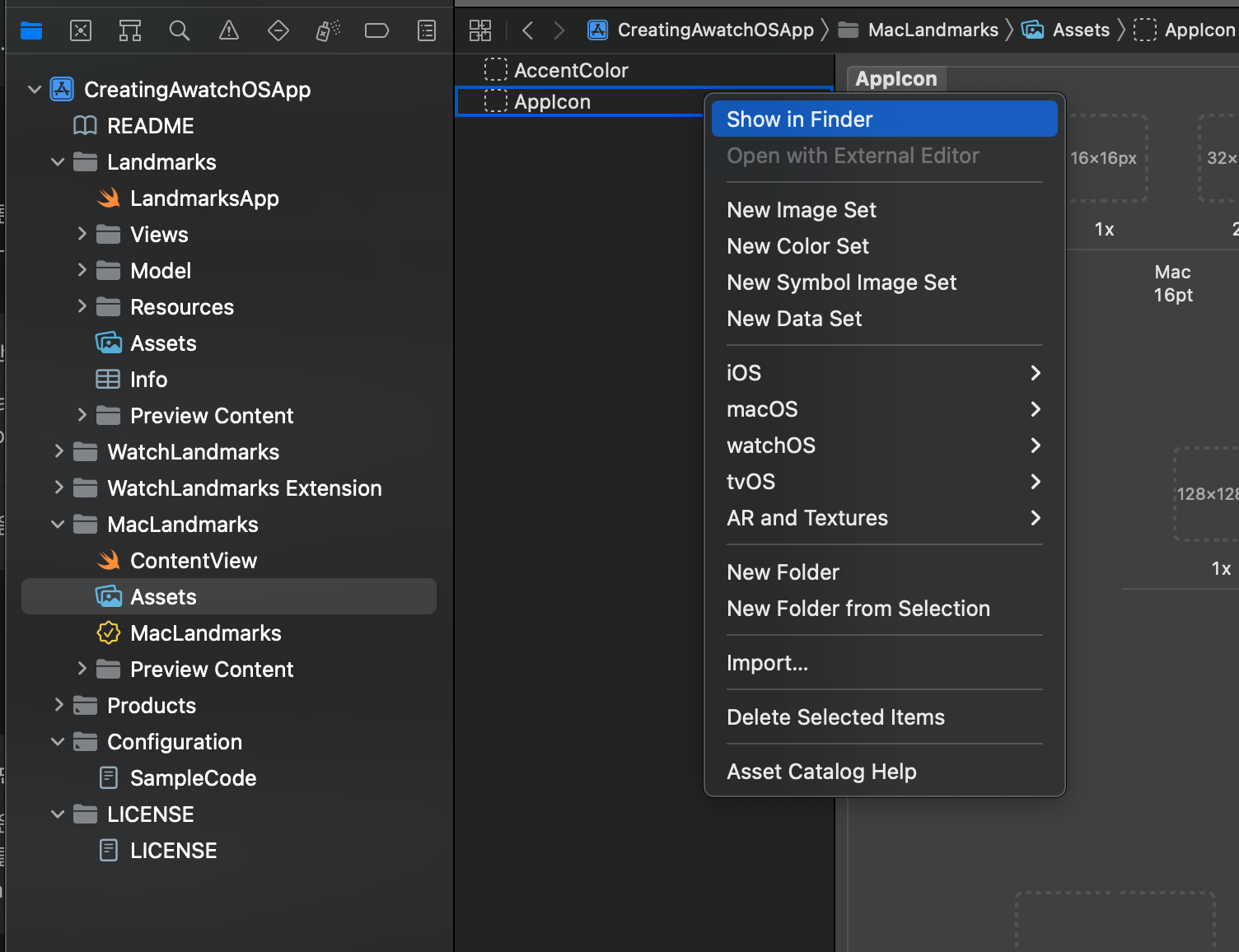 - XCode 네비게이터의 MacLandmarks/Assets > AppIcon 오른쪽 마우스 클릭 > Finder로 열기