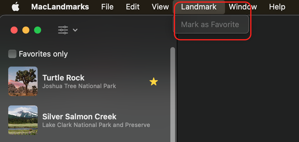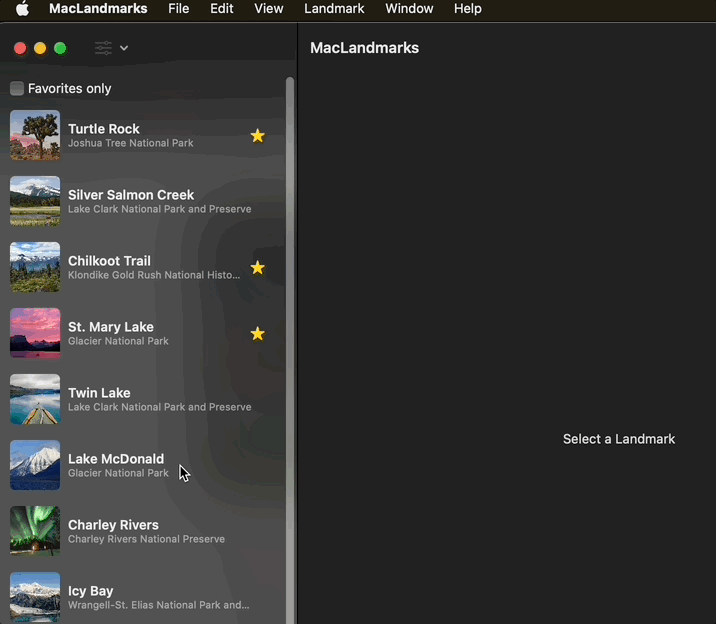 - 커멘드 메뉴에서 Mark as Favorite를 선택하면 selectedLandmark에 적용하기 위함