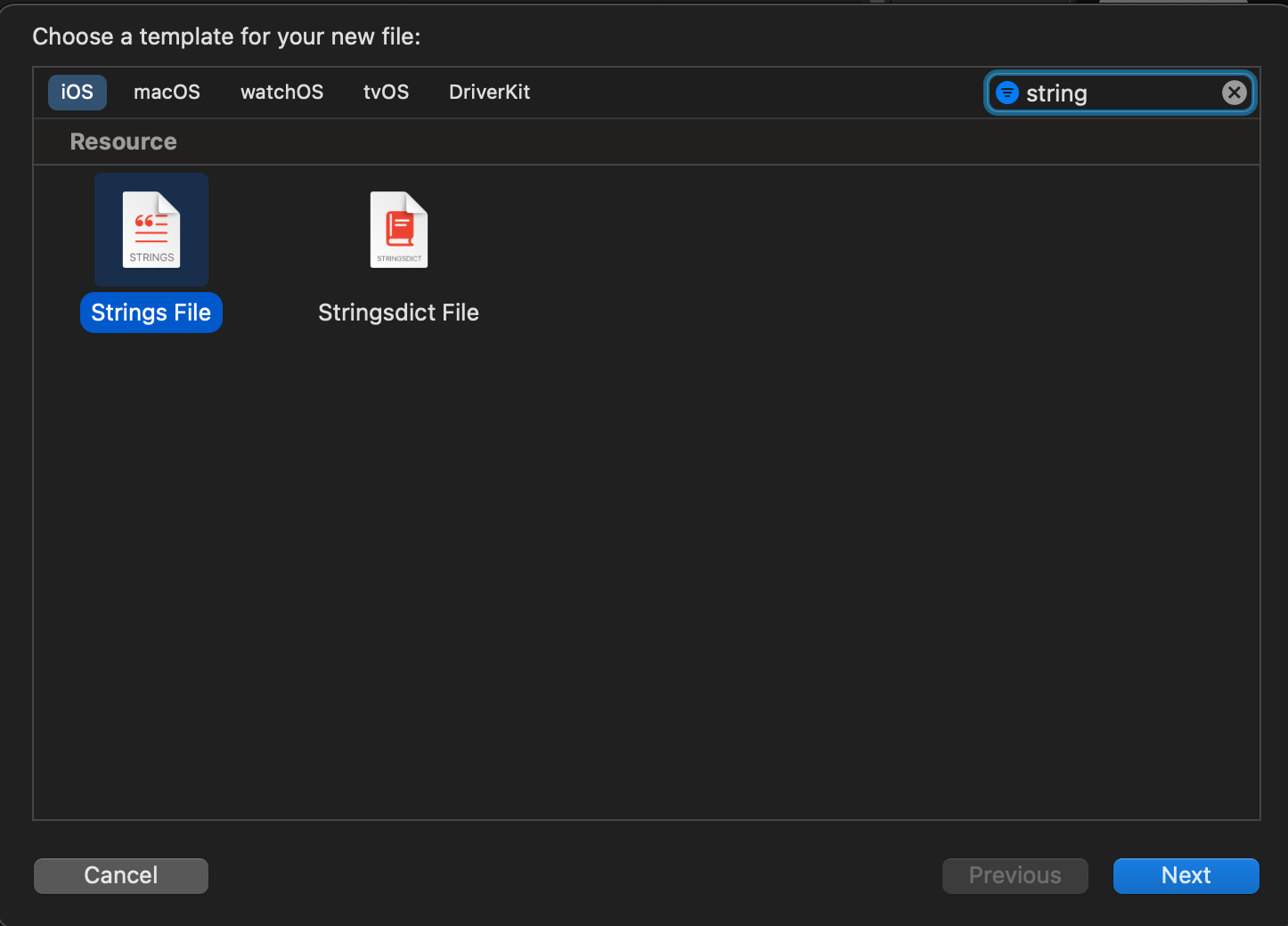 - 새로운 파일 > Strings File 추가
