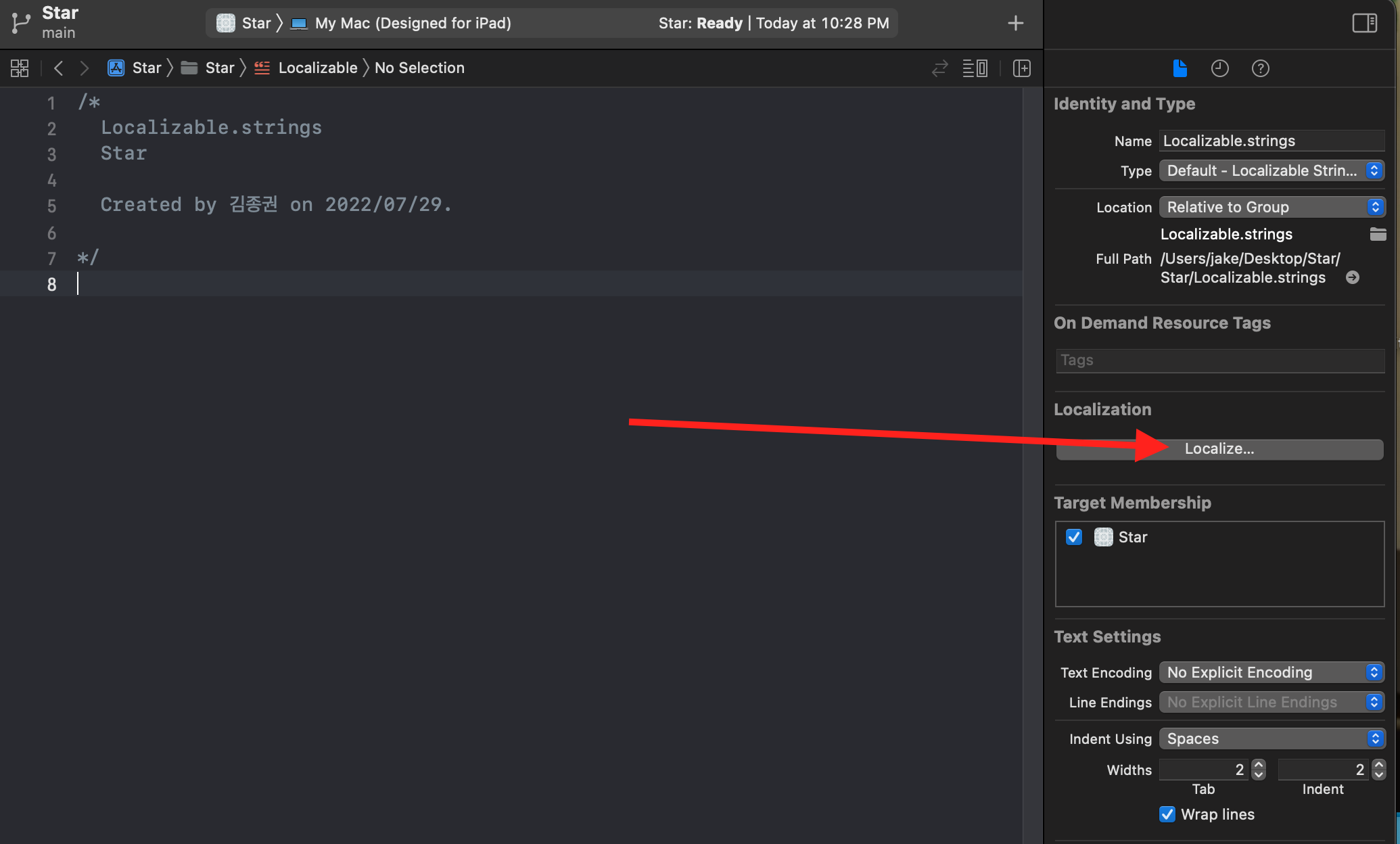 - 생성된 파일을 클릭하고 Localize... 클릭