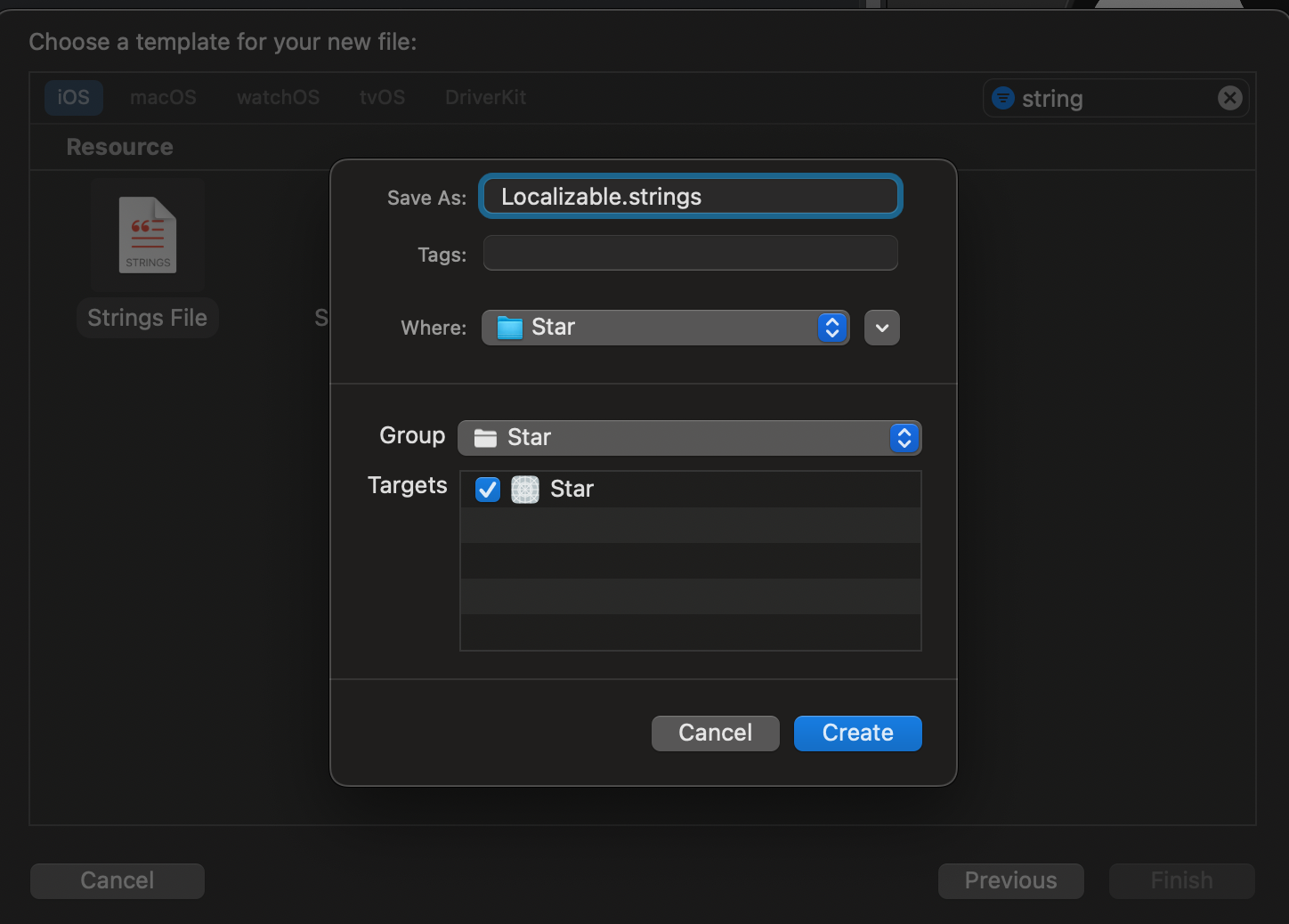- 이름을 Localizable.strings로 하여 생성 (이 이름으로 하지 않으면 오류 발생)