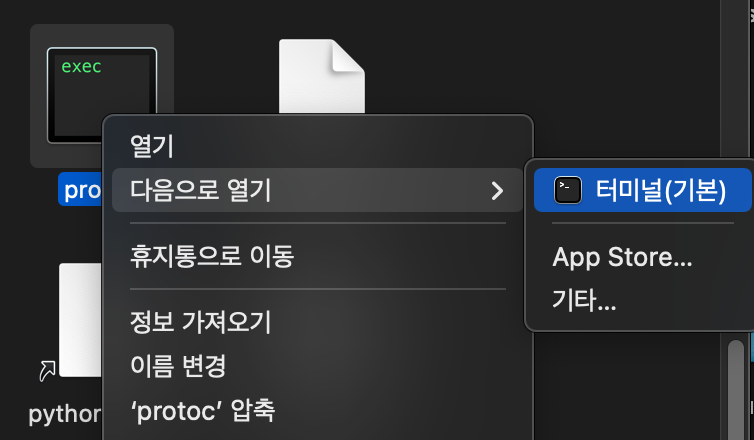 위 protoc > 오른쪽 클릭 > 다음으로 열기 > "터미널(기본)" 클릭 > 개발자 허용 설정 확인