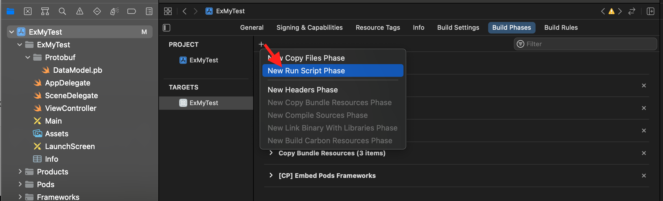 - XCode > Target > Build Phases > +버튼을 클릭하여 New Run Scripts Phase로 빌드 스크립트 생성