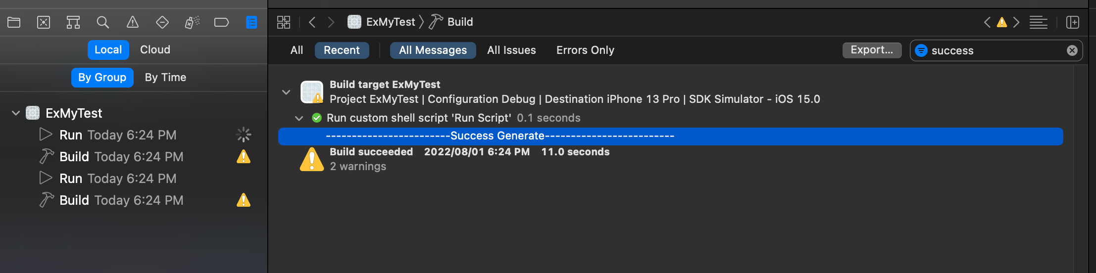 - Xcode의 네비게이션 탭에서 9번째를 클릭하고, success를 검색해보면 로그 확인이 가능