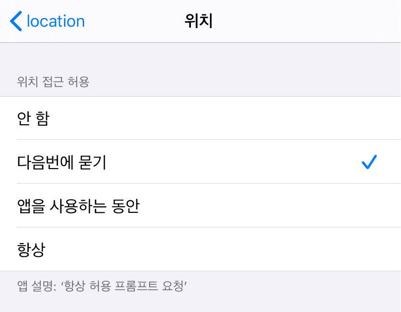 - .notDetermined: `한번 허용`이나 `나중에 선택` 같은 옵션을 선택하고 앱을 종료했다가 다시 킨 경우, 아래처럼 세팅앱에서는 다음번에 묻기로 되어있음