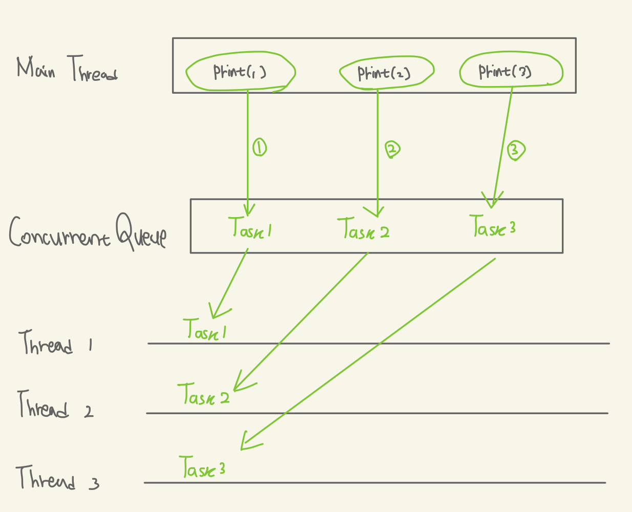 - Concurrent Queue는 Queue에서 스레드로 작업들을 여러개 동시에 전달
