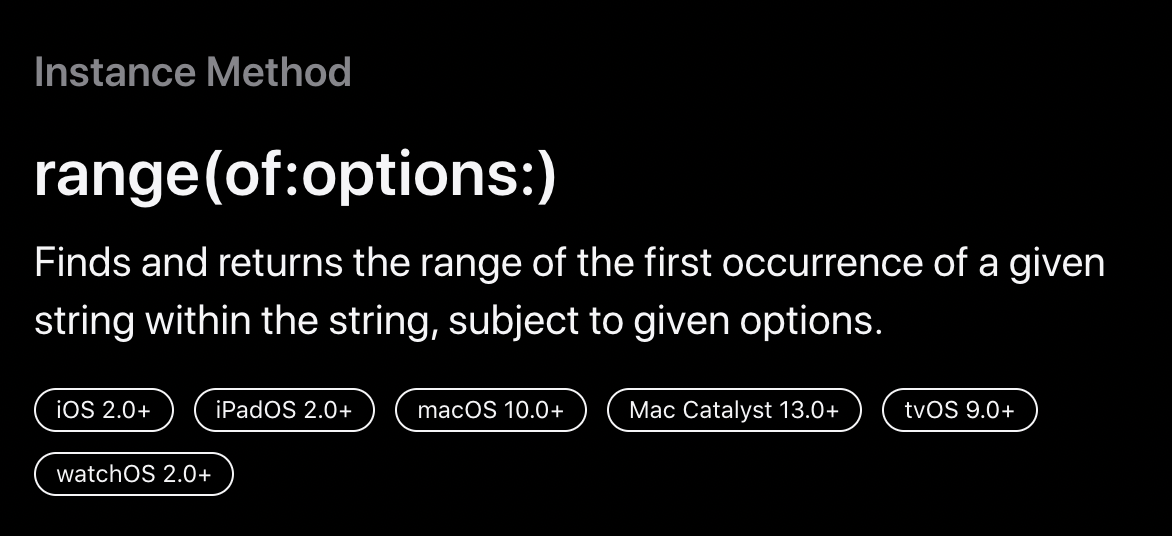 - 확인하는 방법은 range(of:options:)라는 String 메소드 사용