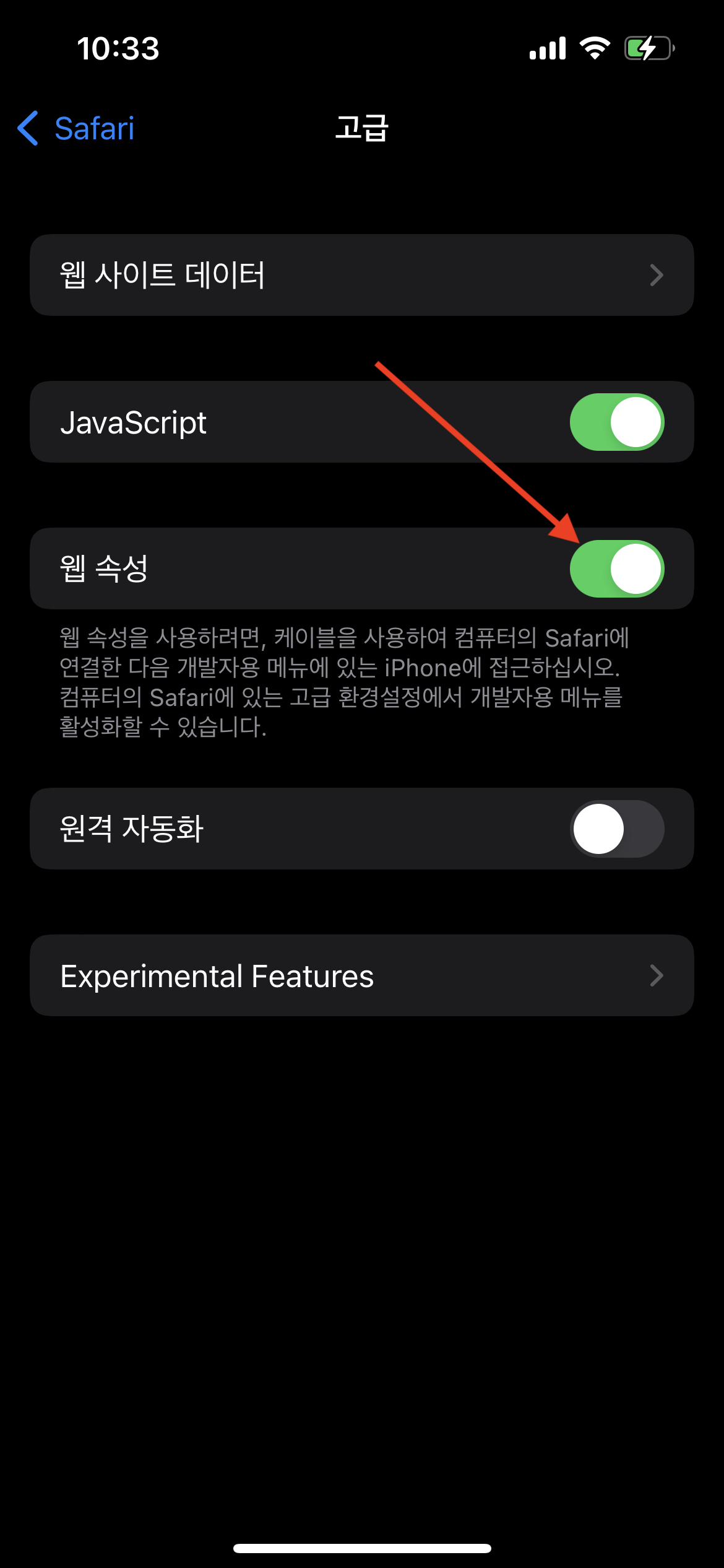 - 디바이스 > 설정 > Safari > 고급 > 웹 속성 On
