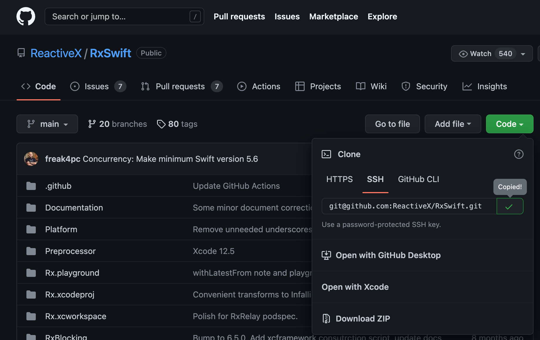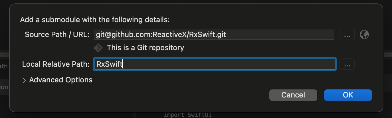 - 복사한 url을 입력하고 Local Relative Path에 위에서 추가한 RxSwift 폴더로 지정