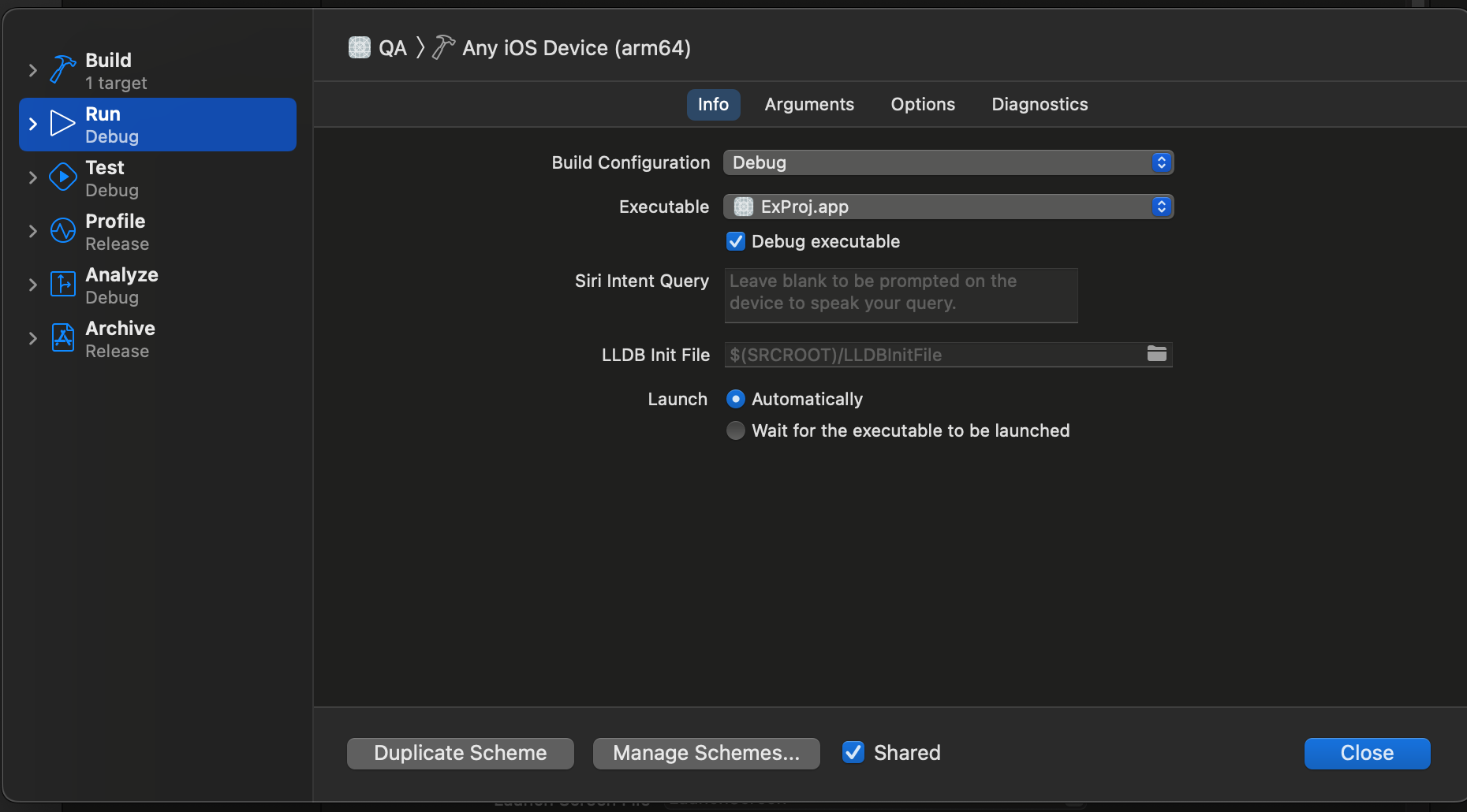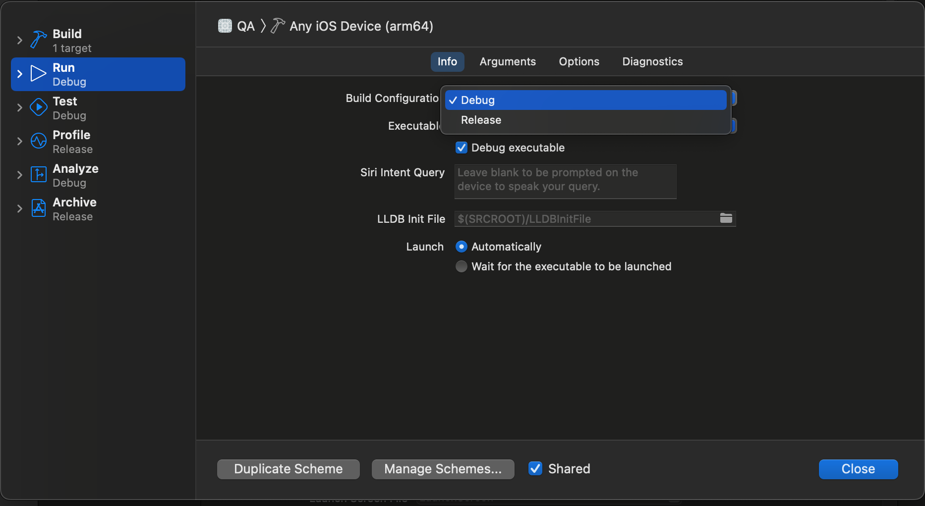 - QA 스킴 > Run > Configuration 설정을 보면 현재 Debug로 되어있는 상태