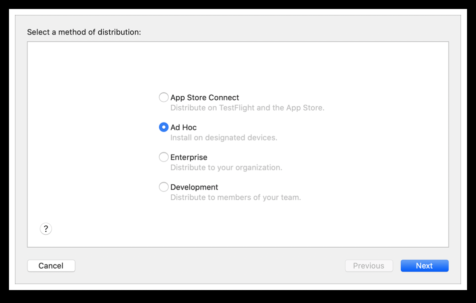 - Ad Hoc: 등록된 장치의 제한된 수의 사용자에게만 배포하려는 경우