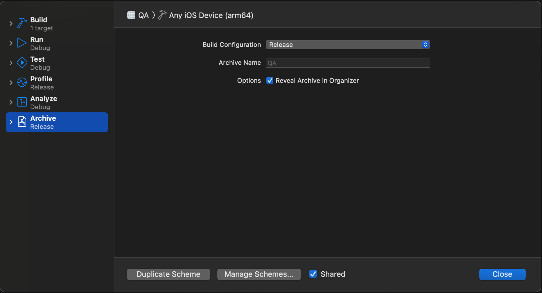 - 왼쪽 탭 Archive에서도 Build Configuration이 존재하여, 빌드를 Archive하여 내보낼때도 여기서 configuration 설정을 먼저 해주어야함