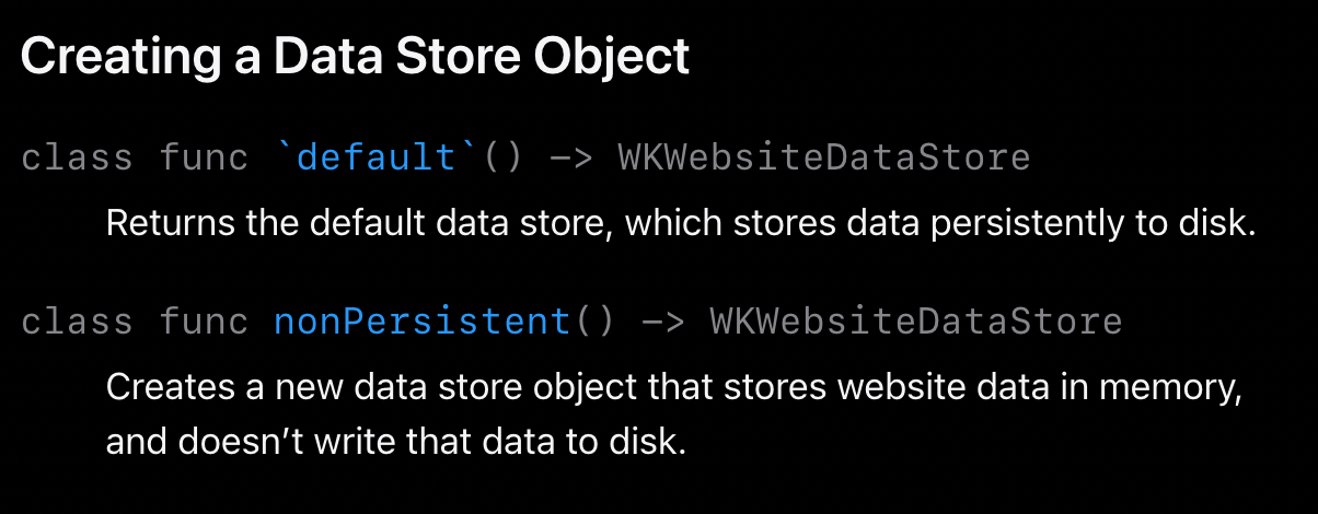 let dataStore = WKWebsiteDataStore.nonPersistent() // <-