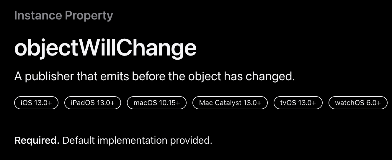 - 이 프로토콜을 준수하는 클래스는 objectWillChnage 프로퍼티 사용이 가능