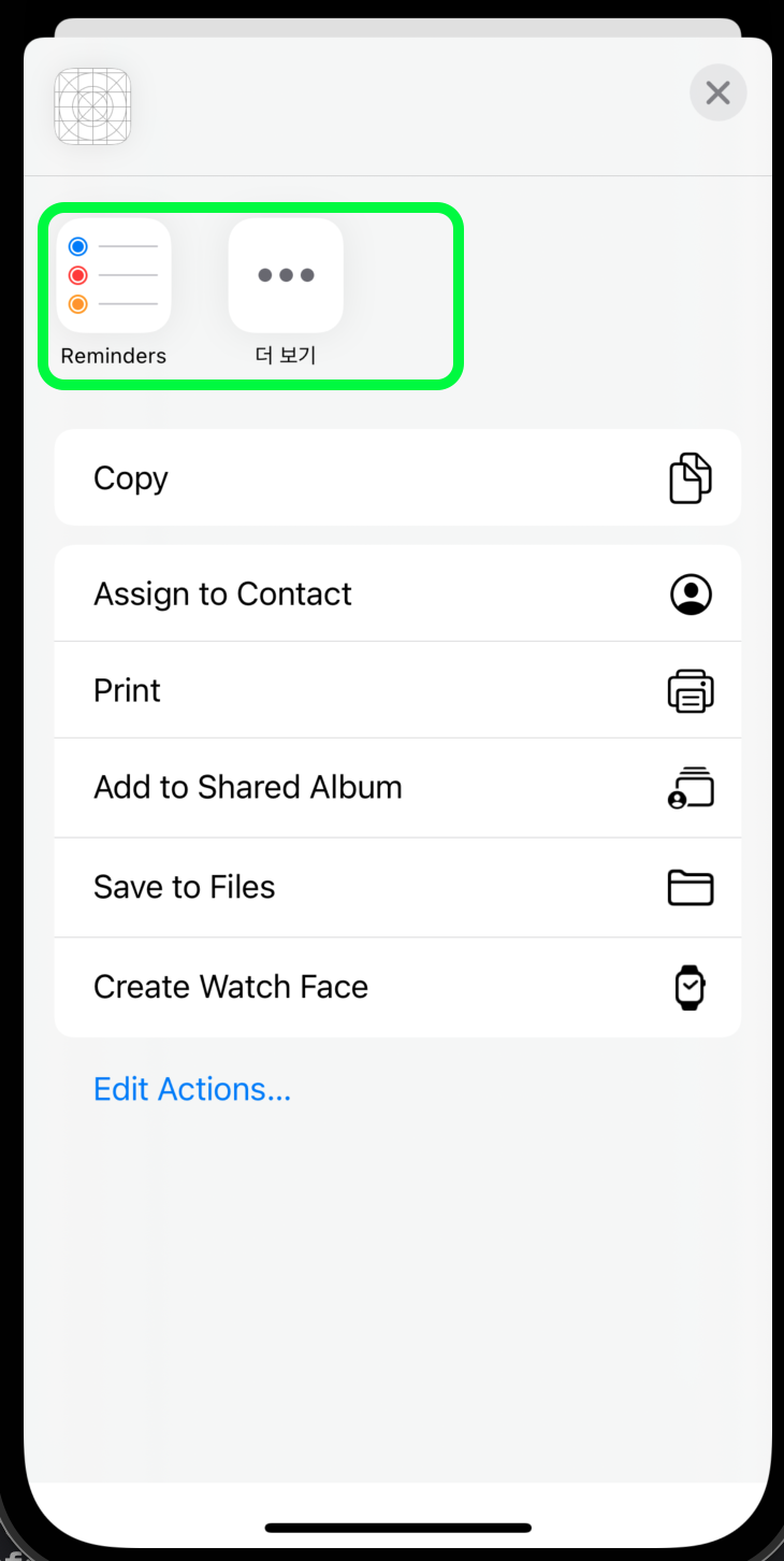- activityItems: UIImage와 같은 값을 넣어서 해당 아이템을 copy, aasign to contact, print... 등을 수행