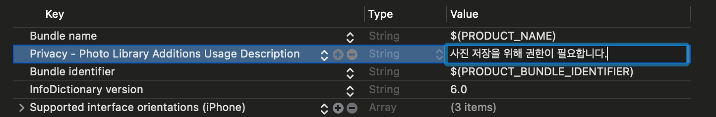 - ex) 사진 저장을 위해 권한 요청하기 위해 NSPhotoLibraryAddUsageDescription 키값을 추가하여 사용