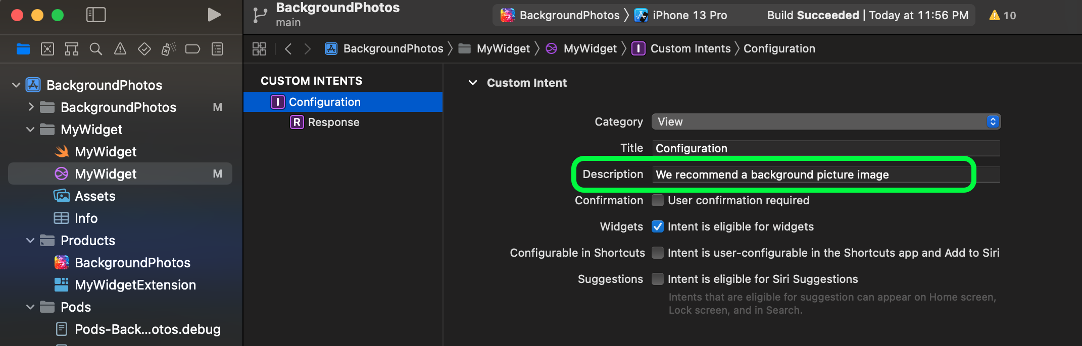cf) 네비게이터 좌측에 있는 MyWidget.intentdefinition 파일을 열고, Description에 내용을 채워주지 않으면 리젝 사유