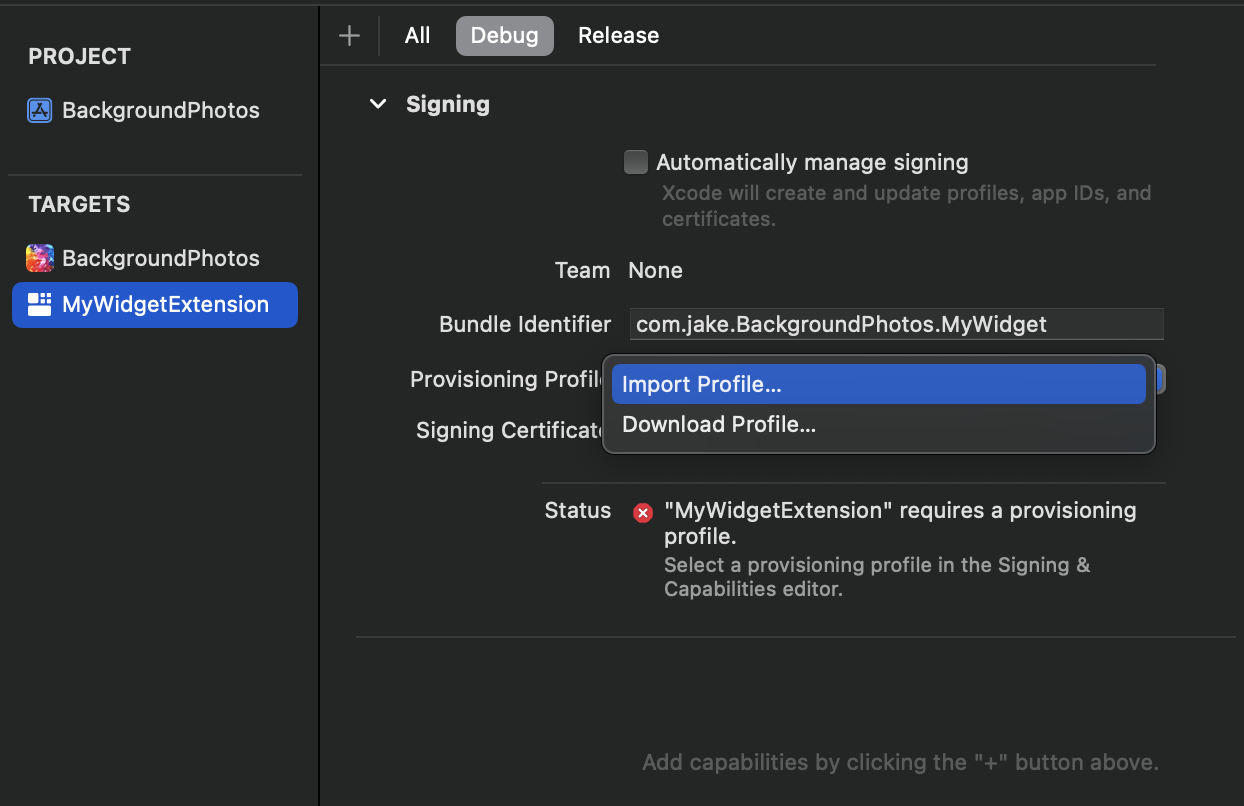 - Automatically manage signing 해제 후 Import Porfile