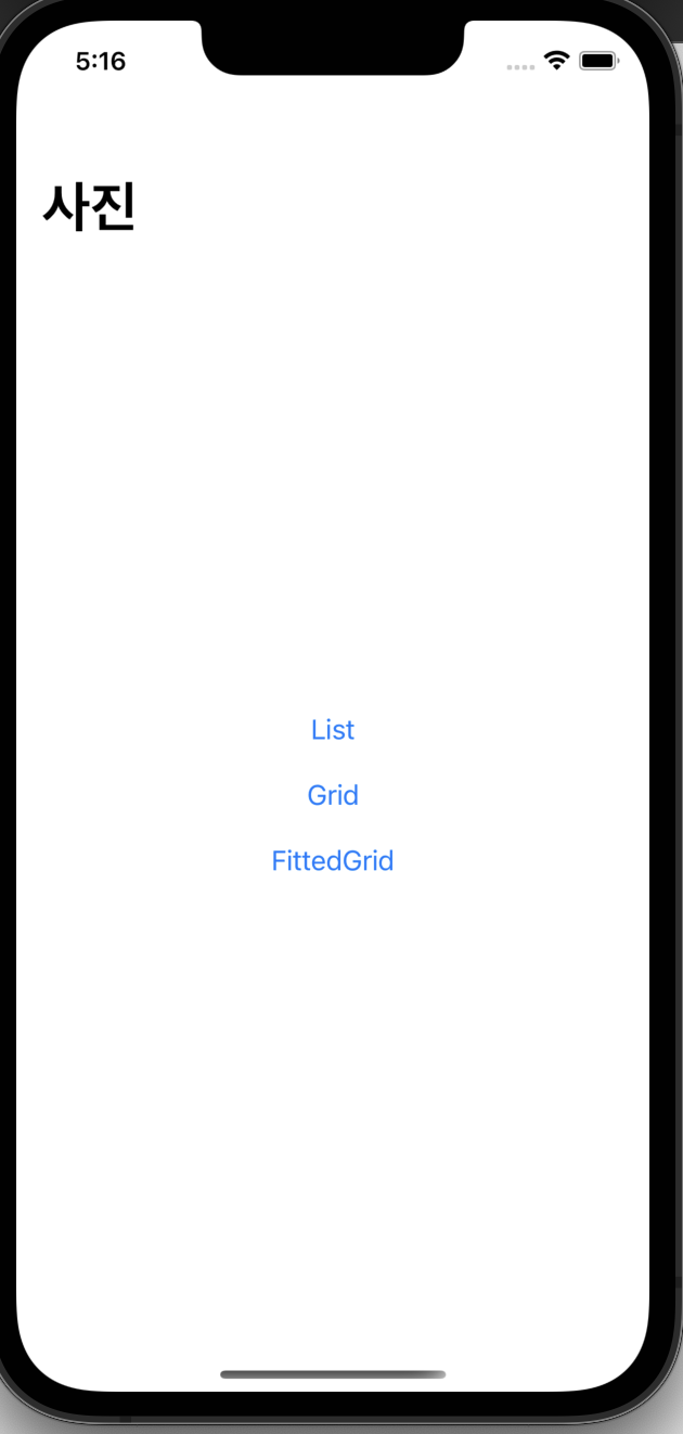 List, Grid, FittedGrid 네비게이션 링크가 있고, 탭하면 각각의 뷰 형태를 확인이 가능)