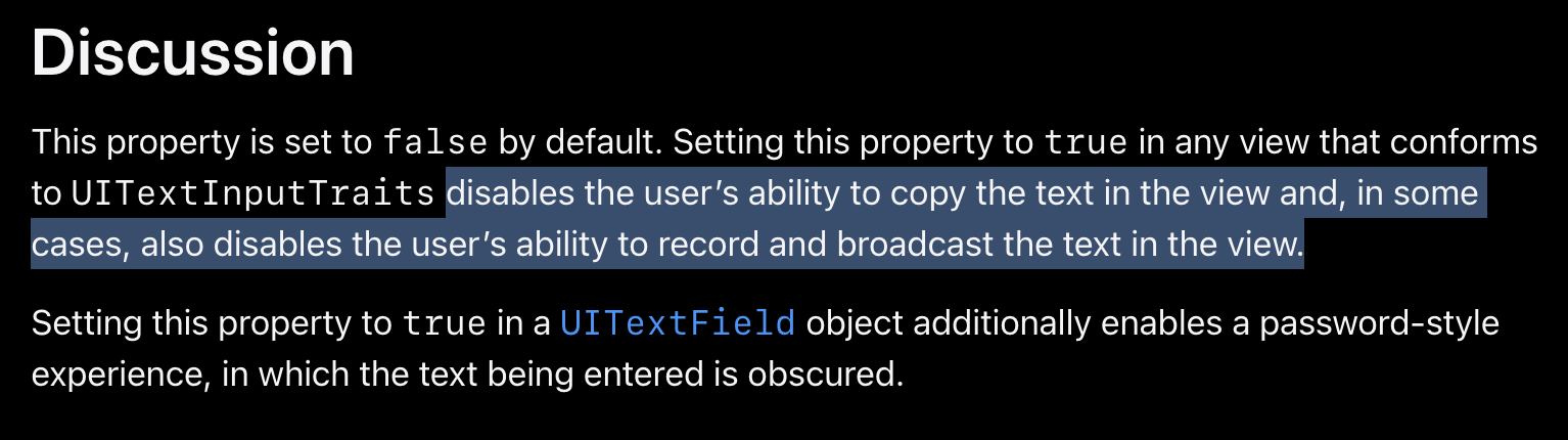 https://developer.apple.com/documentation/uikit/uitextinputtraits/1624427-issecuretextentry