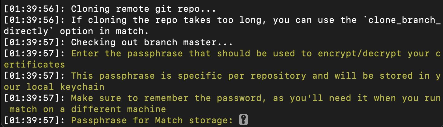 - 명령어를 입력하면 terminal에서 MatchFile에 입력된 username과 app_identifier를 참고하여 Apple Developer에 Certificates를 새로 생성하고 Profiles도 자동으로 추가