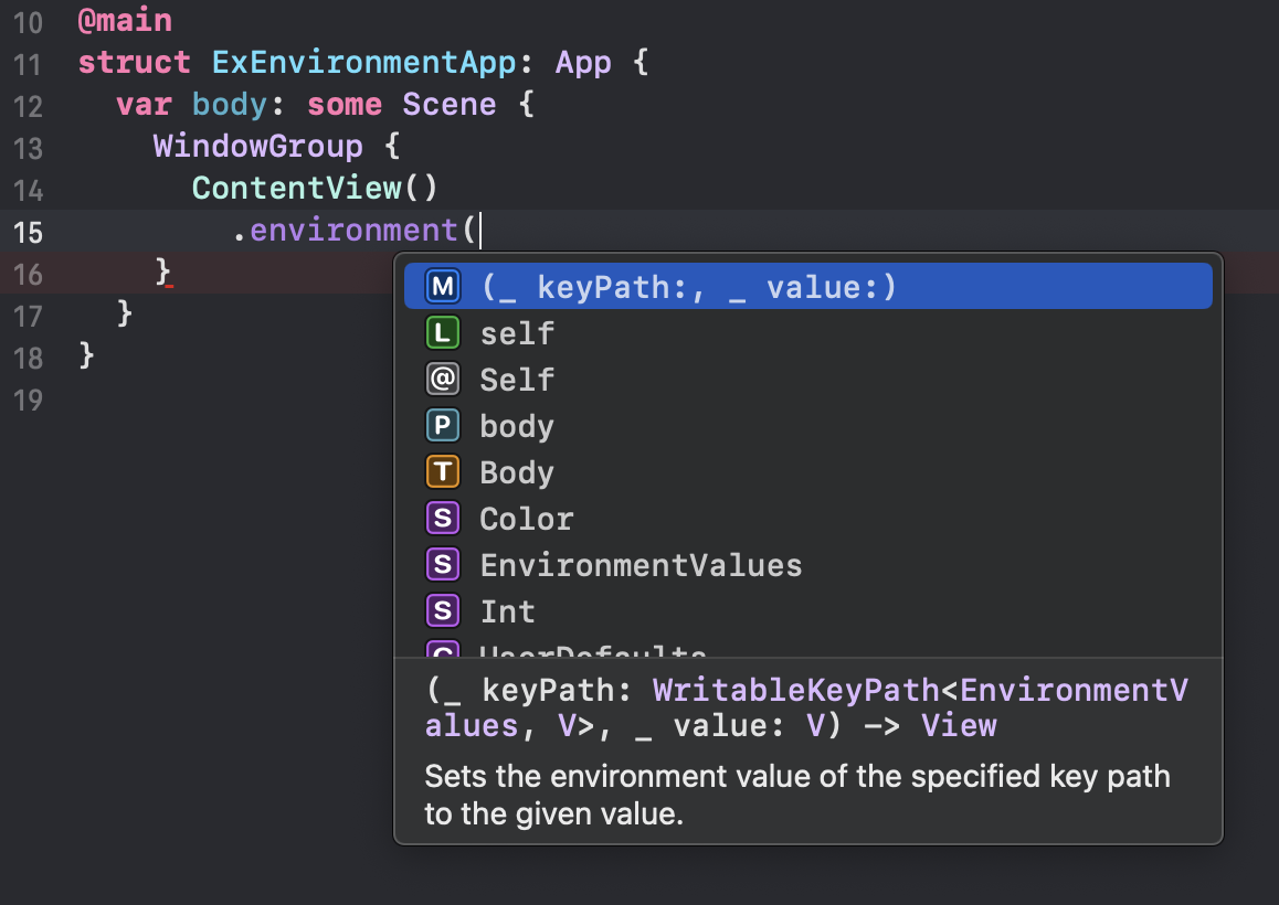 - key값은 EnvironmentValues 형태이며, EnvironemntValues 값은 커스텀해서 만들 수 있고 SwiftUI에서 미리 정해진 값들이 존재