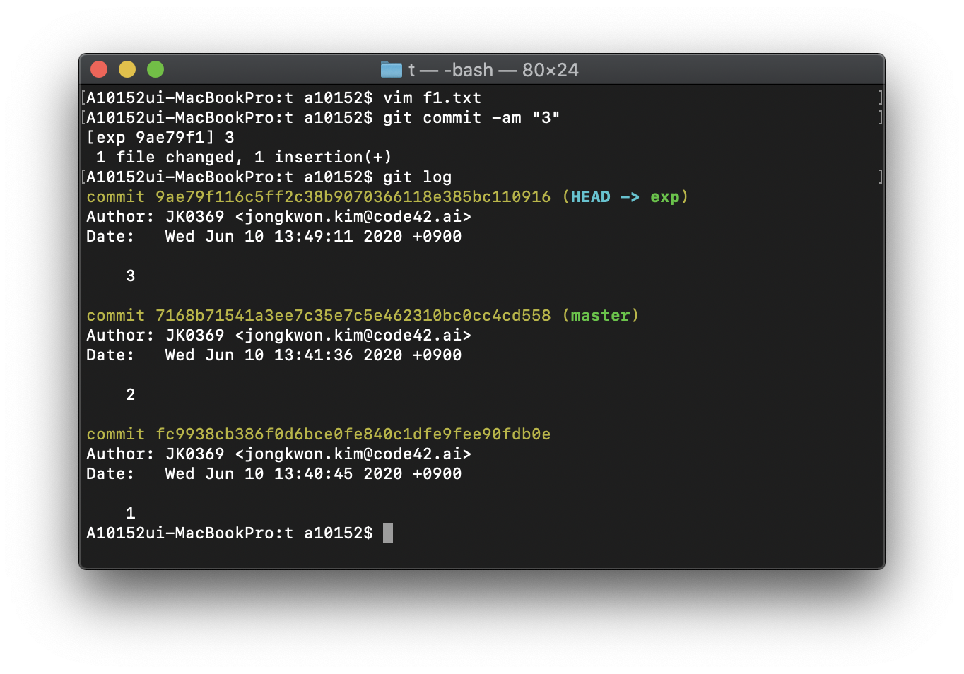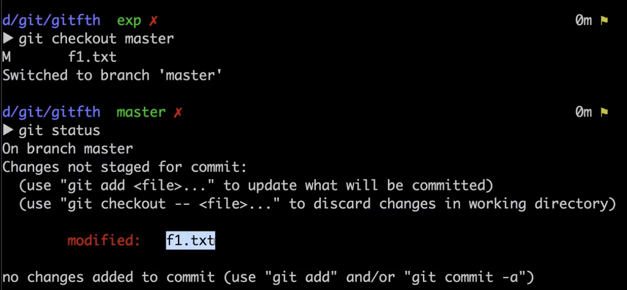 -> 이제 f1.txt는 exp에서 수정한 내용을 담고 있지 않음