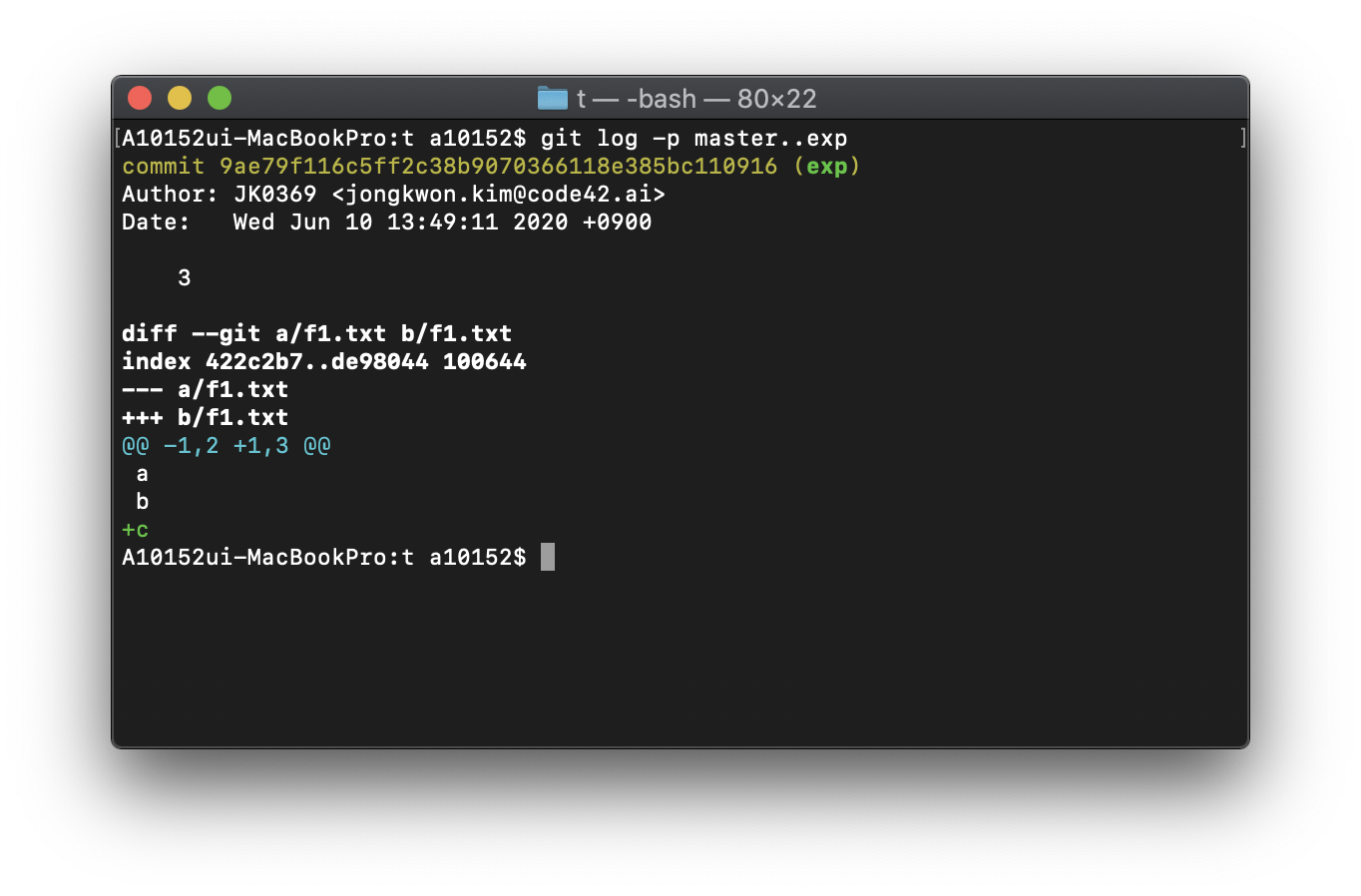 git branch -b exp -> f1.txt수정