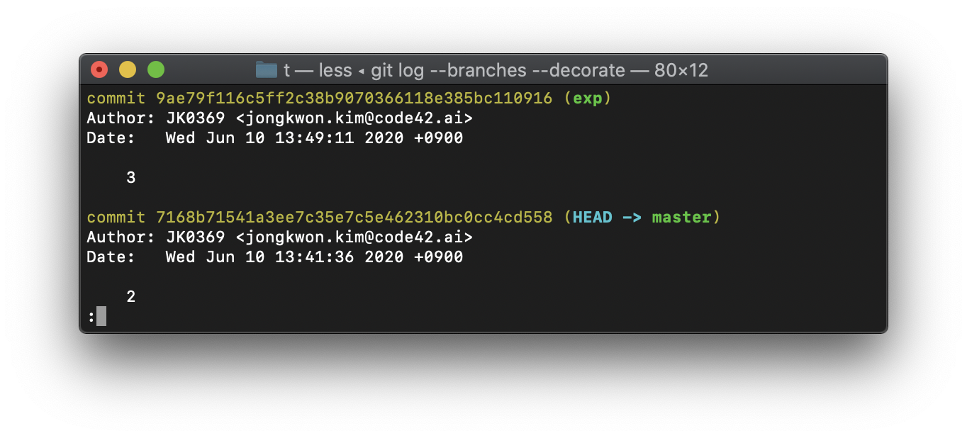 master는 exp가 작업했던 3번 커밋, 내용을 가지고 있음