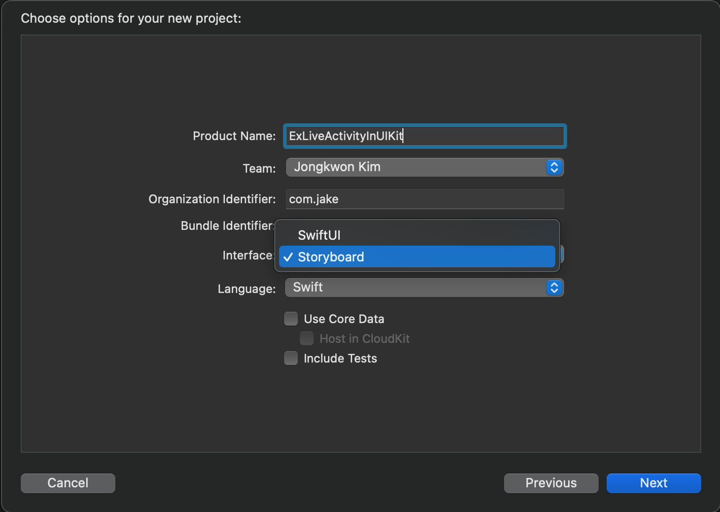 - Interface > SwiftUI가 아닌 Storyboard 선택