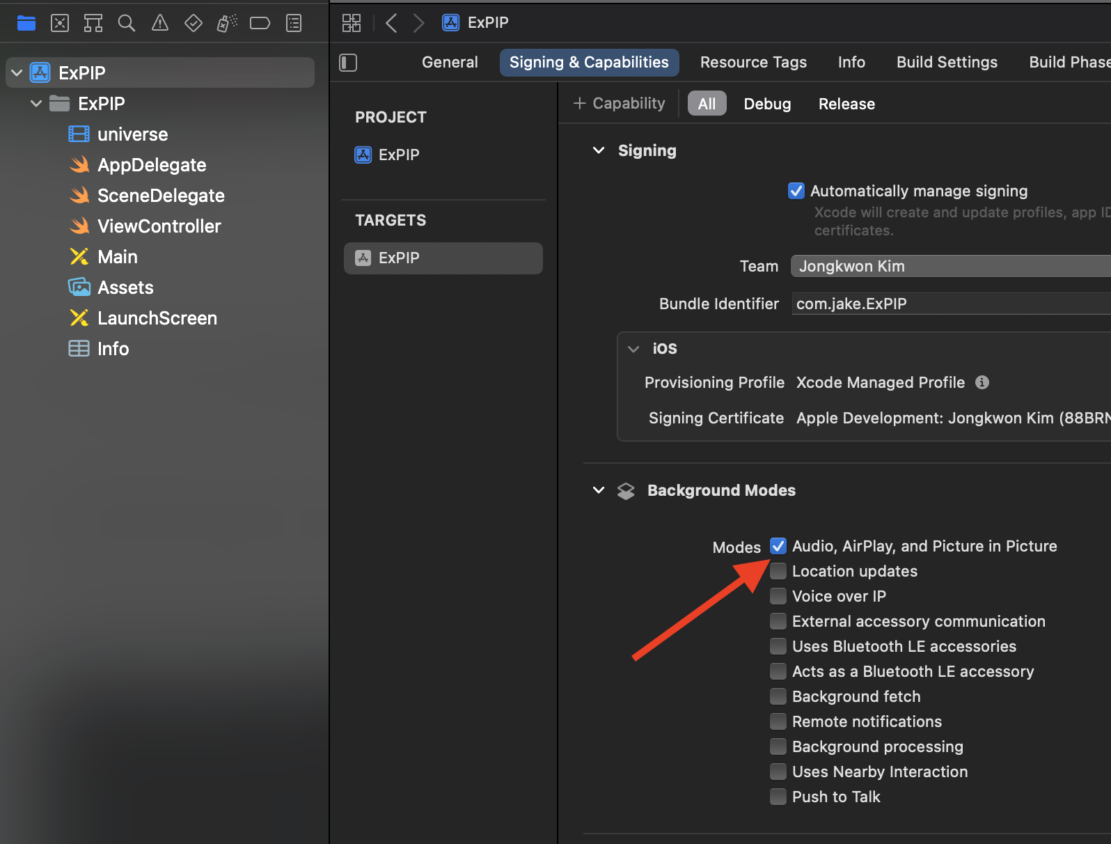 - 아래 그림과 같이 Modes > Audio, AirPlay, and Picture in Picture 체크