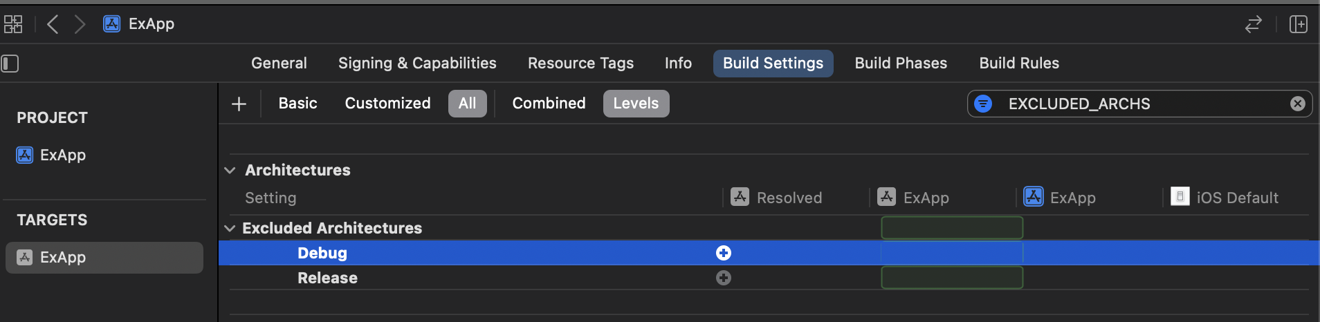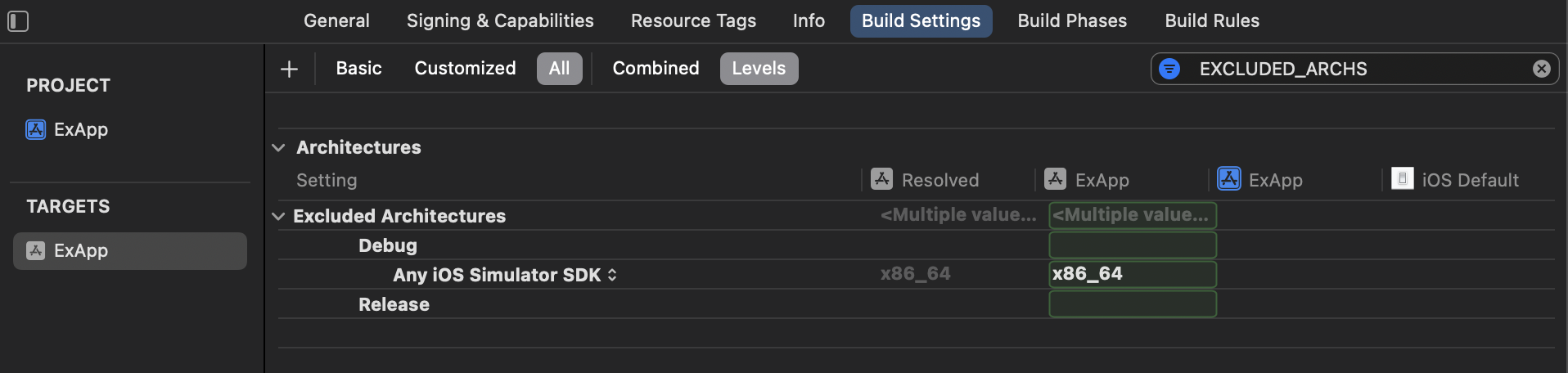 - Xcode > Target > EXCLUDED_ARCHS 검색