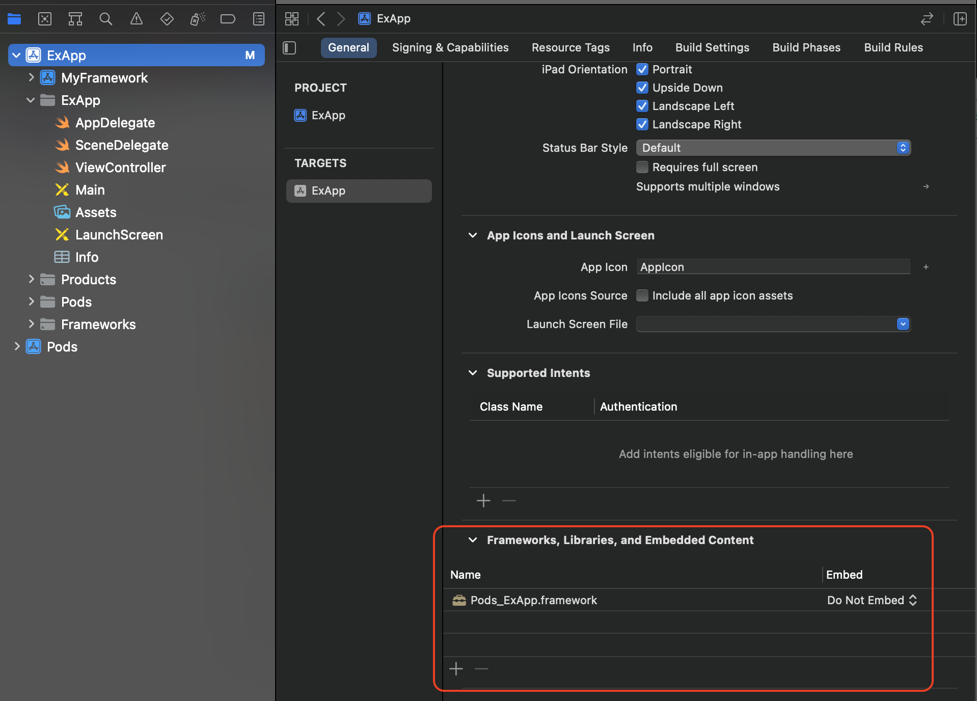 (위에서 만든 프레임워크는 Dynamic Framework이므로 Embed & Sign으로 설정)