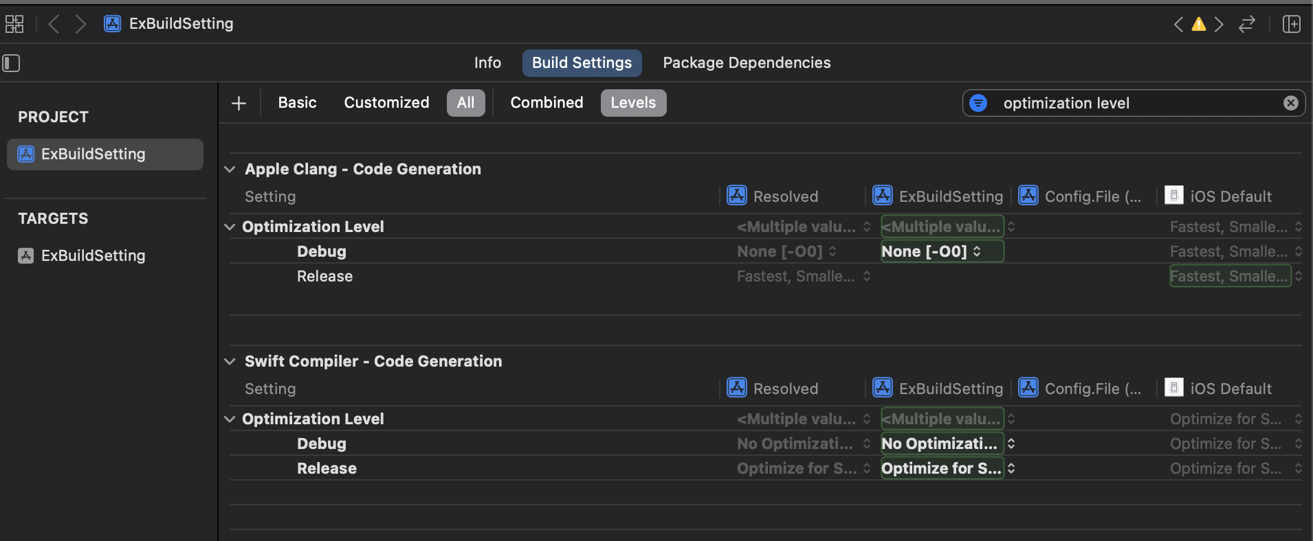 - Build Settings에서 optimization level을 검색하면 Apple Clang과 Swift Compilier 두 종류가 존재