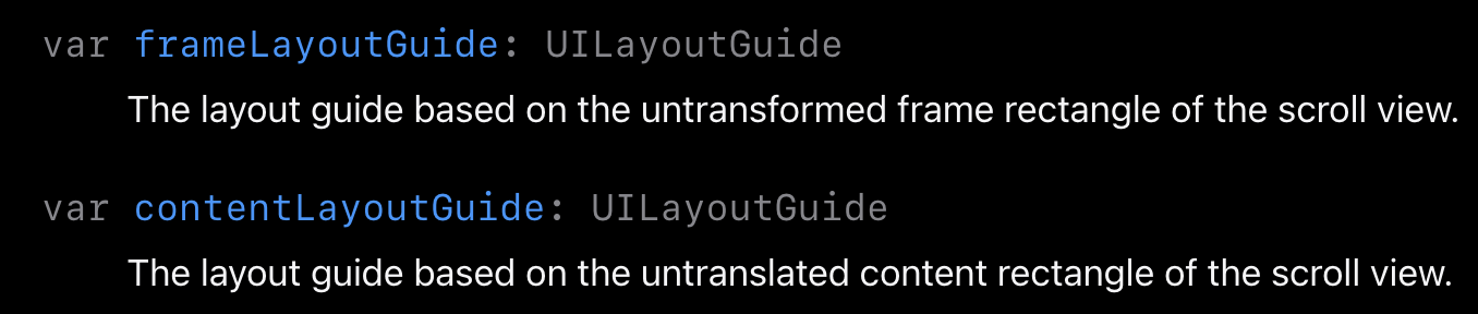 - contentLayoutGuide: 변형되는 레이아웃 (내부 컨텐츠의 intrinsic content size에 의해서 변형)