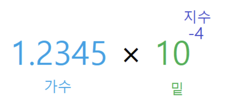 - 가수는 1.2345 숫자이고, 지수는 말 그대로 exponential를 의미