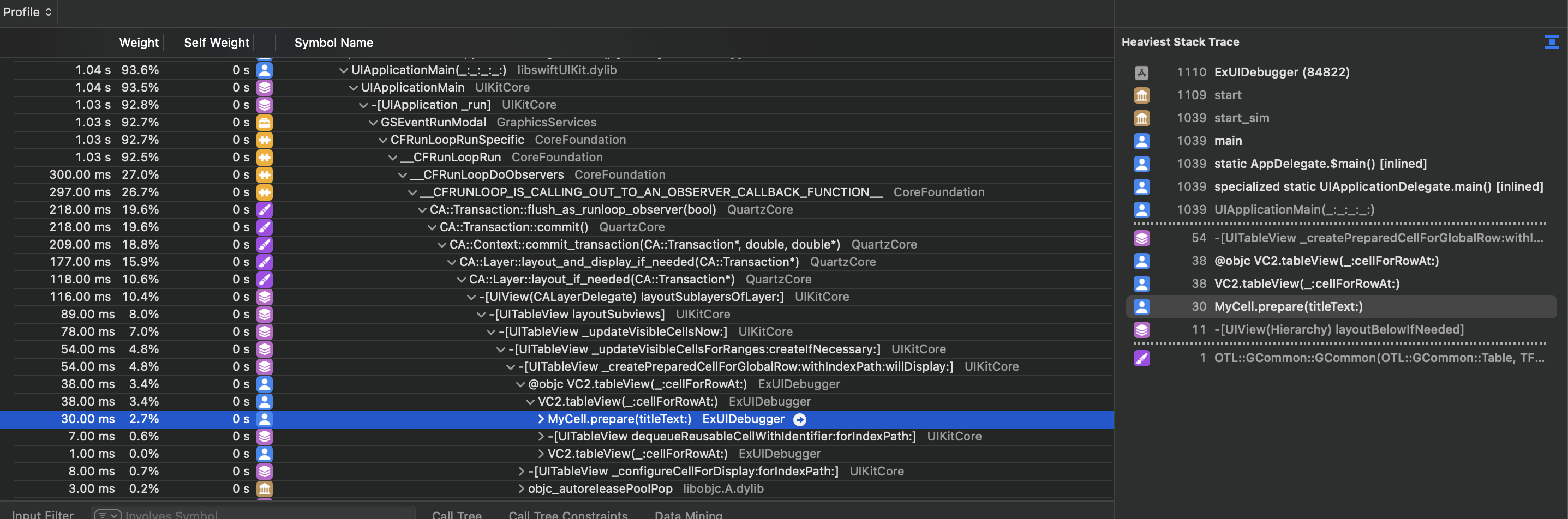 - Profile 선택 > 오른쪽 Havial Stack Trace에서 UI관련코드 선택